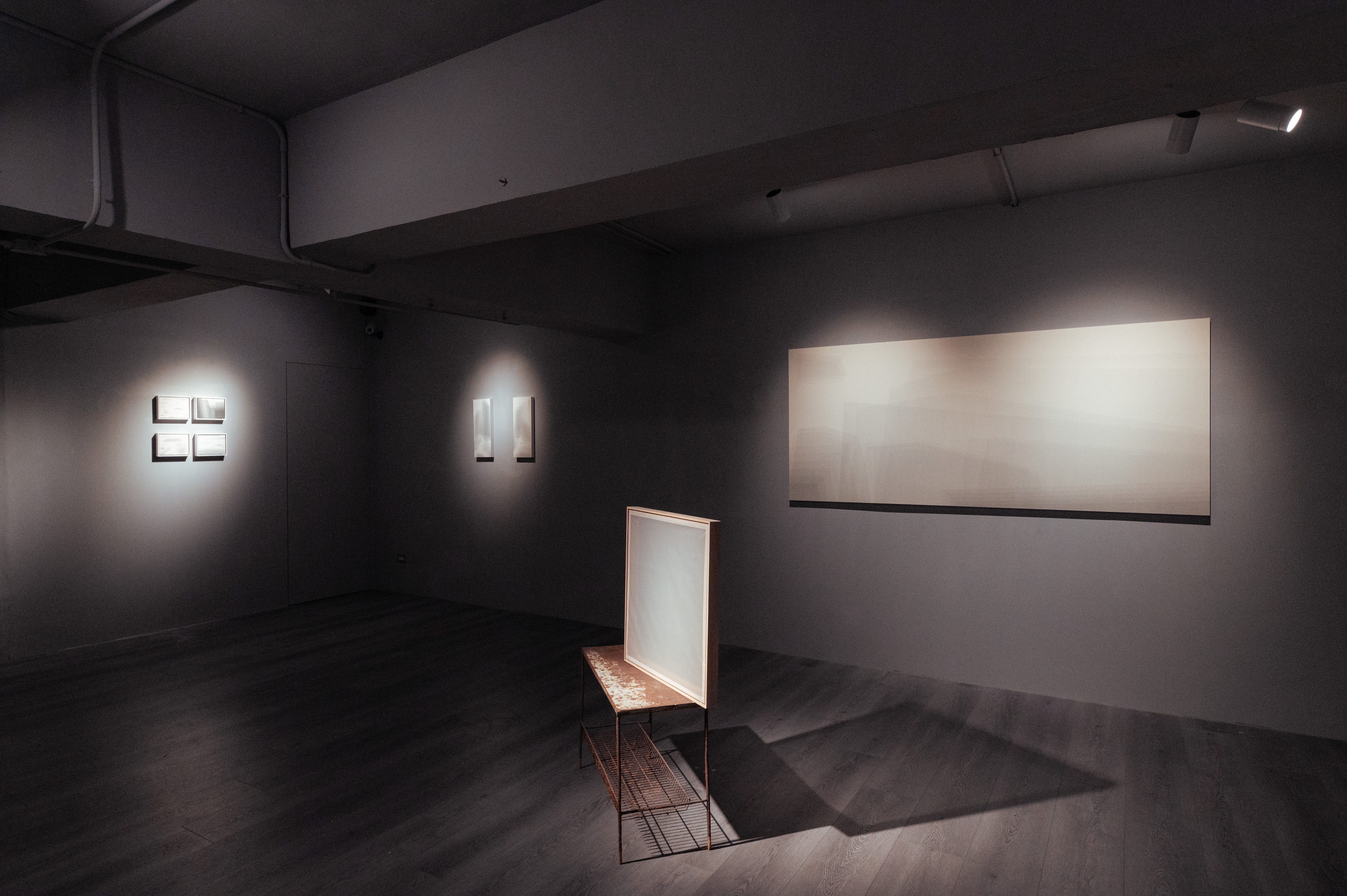 清水、墨汁與絹的材質特性,具有不同透明度的疊加,可以穿透的塊狀物,嘗試用繪畫組成影像感,轉化山水本體既定的概念和質感。引用尚・布希亞 ( Jean Baudrillard )「擬仿物」的觀念,在影像化的時代,用影像感引發思索,重新思考眼前的山水為何物,這是所謂水墨畫、國畫還是山水畫嗎?