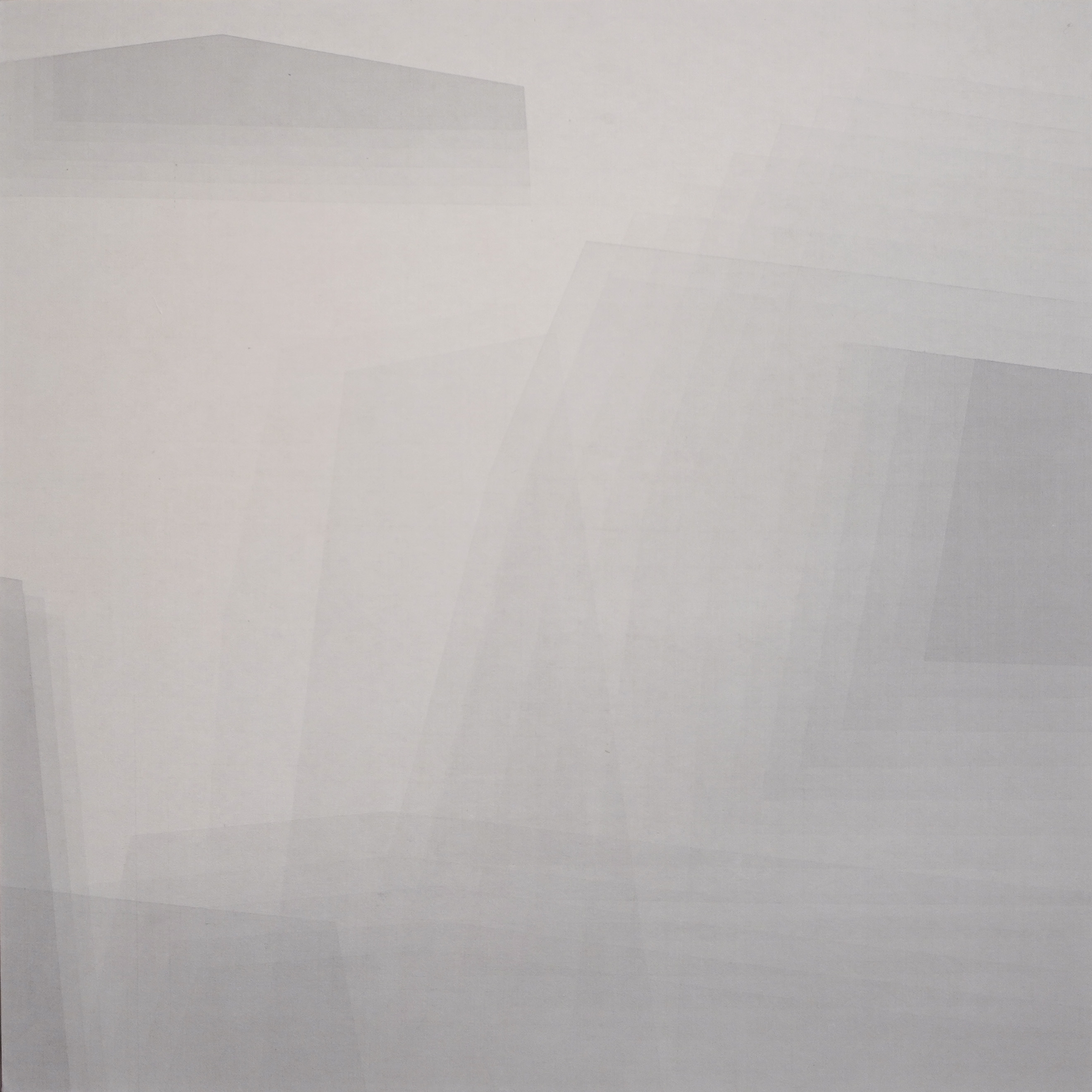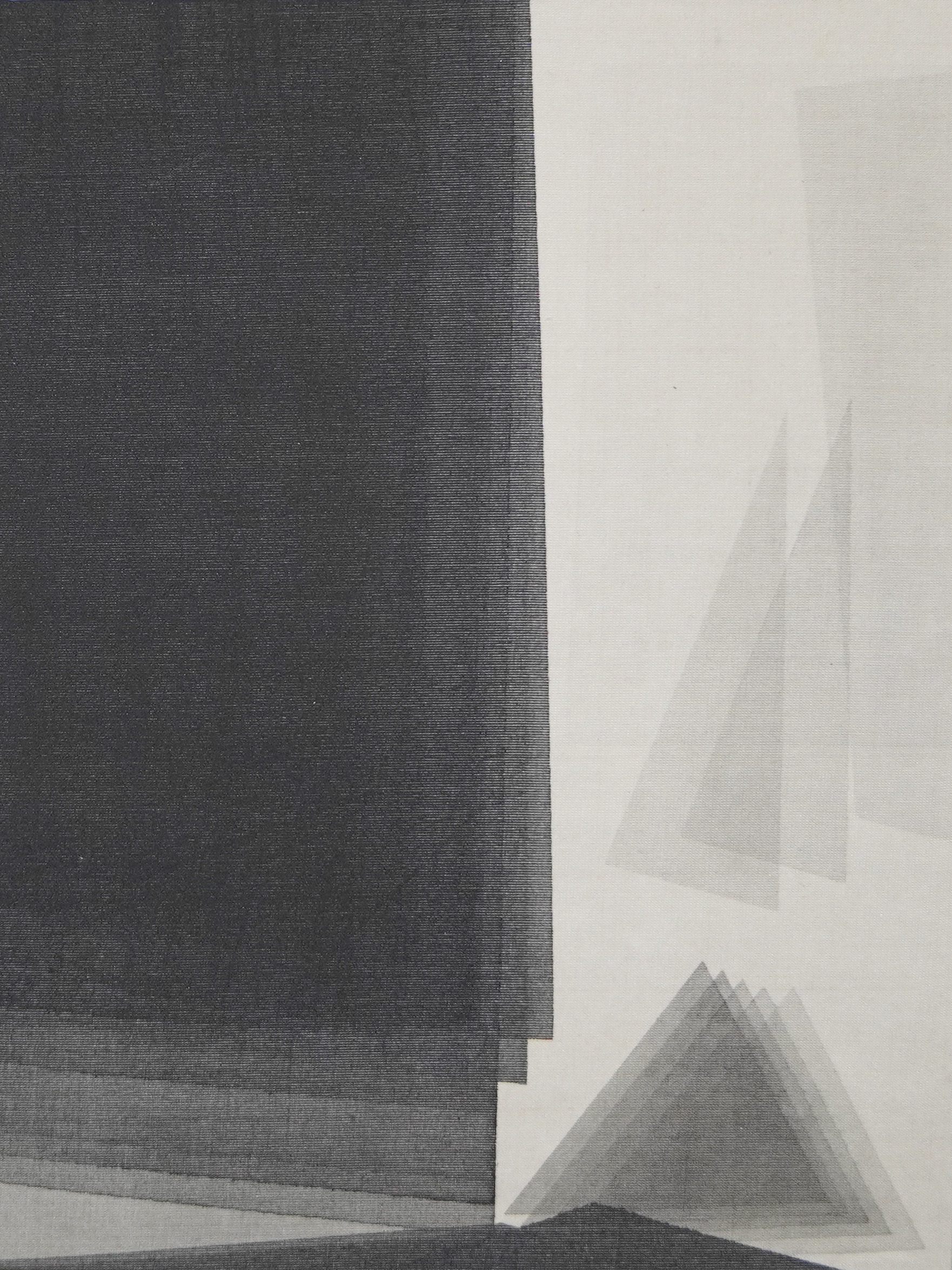 所以千百年來騷人墨客要在山水間尋找宇宙運行之道。我憑藉自己觀看山水畫所建構的視覺經驗,如修行般,一次又一次層層堆疊。以最淡薄的墨色層層刷染,解構自然山體,簡化傳統水墨作品中的山石造型為現代幾何,再以古典流傳至今的手法— 磨墨、繃絹、單色墨塊反覆疊加,模擬皴法線條繪製的過程,不斷地以相同行為反覆繪製、疊加